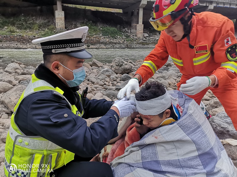 救援人员赶到现场发现,一挂车车头已经面目全非,一地的柴油、机油混杂在一起,刺鼻难闻,驾驶人员和整个车头不见踪影,民警最终在公路外侧搜寻发现,在距离10多米远的河道里找到大货车驾驶室和被困人员。经询问了解,驾驶人意识清晰,头部受伤,身上有血迹,身体极度虚弱,民警一边安抚受伤人员情绪,一边在车头里找来被子披在伤员身上进行保暖。