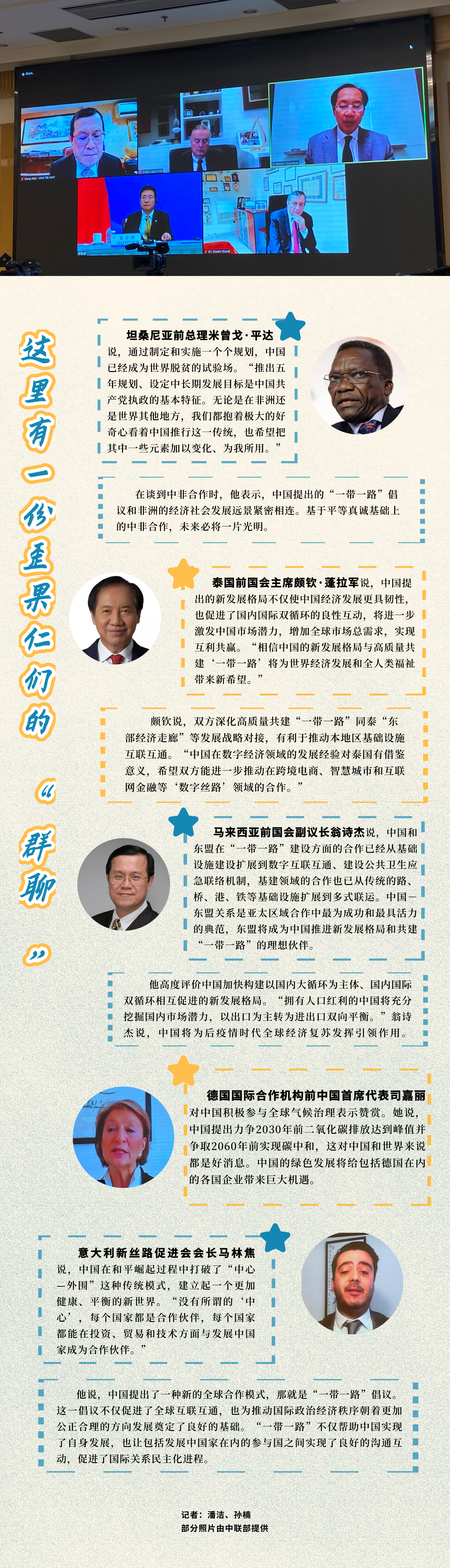 14日下午,在由中共中央对外联络部发起成立的“一带一路”智库合作联盟举办的“中国新发展格局与高质量共建‘一带一路’”国际视频研讨会上,马来西亚前国会副议长翁诗杰用流利的中文在会上发言。包括翁诗杰在内的“中国通”们如何评价中国的新发展格局和“一带一路”建设?在这场跨洋“群聊”中,外国前政要和智库专家学者就中国发展碰撞出了怎样的火花?一起来看看。