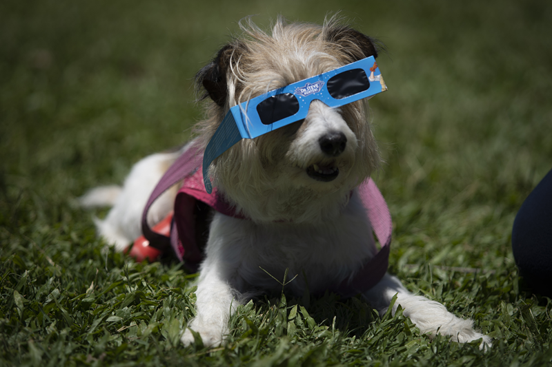 12月14日,阿根廷首都布宜诺斯艾利斯,市民为自家爱犬戴上日食观测镜。新华社发