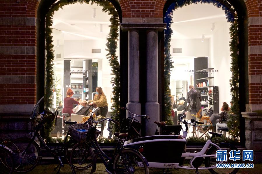 12月14日,在荷兰哈勒姆,人们在理发店中理发。