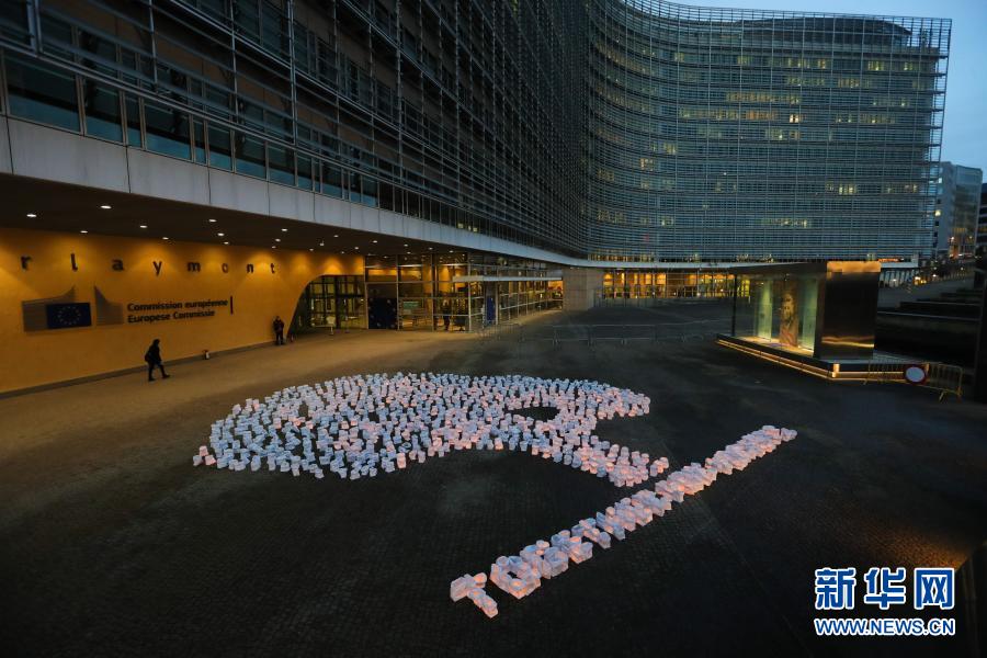 当天,环保人士在比利时布鲁塞尔的欧盟委员会总部外举行活动,用装有蜡烛的纸袋摆成树木的形状,呼吁人们保护森林。