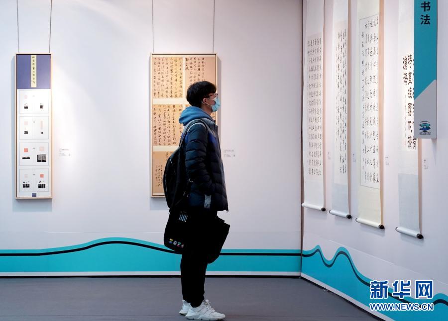 12月15日,一名参观者在欣赏大学生书法作品。