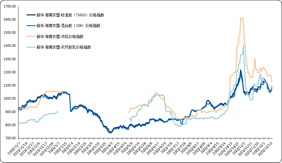 新华·海南农垦-天然橡胶系列价格指数显示,截至12月14日,标准胶(TSR20)价格指数报1082.56点,较12月7日(下同)下跌2.32%;混合胶(20#)价格指数报1072.24点,下跌1.38%。新华·海南农垦-浓乳价格指数报1123.44点,下跌4.46%;新华·海南农垦-天然胶乳价格指数报1097.45点,上涨2.76%。
