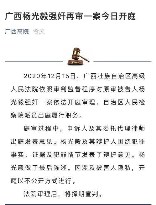 12月15日,备受关注的广西杨光毅强奸一案(百香果女孩案),在钦州市灵山县人民法院再审。广西壮族自治区人民检察院派员出庭履行职务。