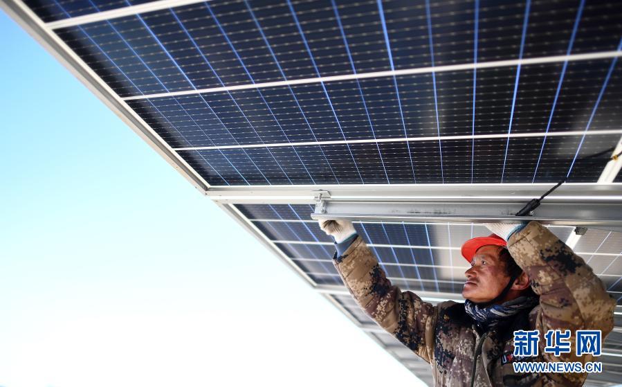12月15日,在青海省海南藏族自治州共和县中国大唐集团有限公司30万千瓦竞价光伏项目现场,工人在进行安装作业。