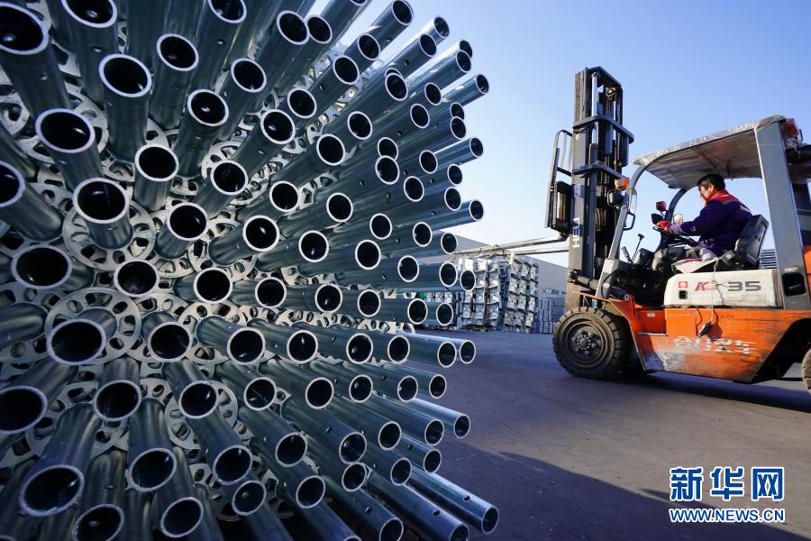 12月15日,由北京转移到乐亭县的一家建筑支护装备制造企业的工人在厂区内转运产品。