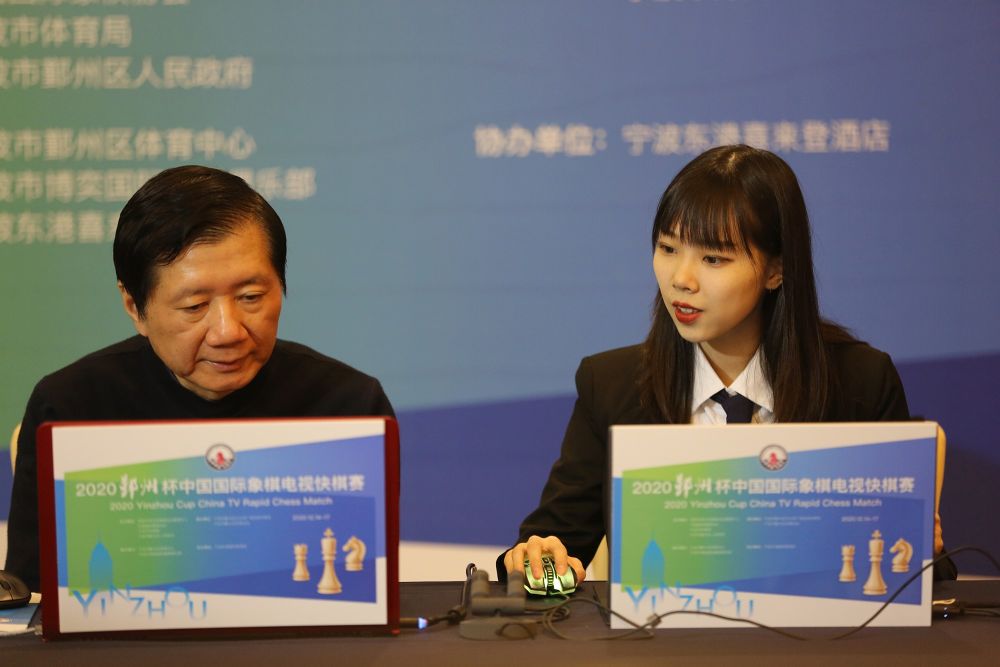 国家男队主教练徐俊和女子国际象棋大师裘孟洁讲棋。