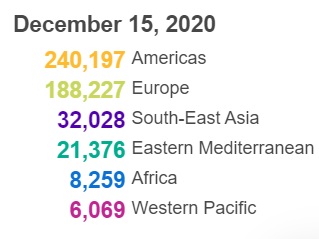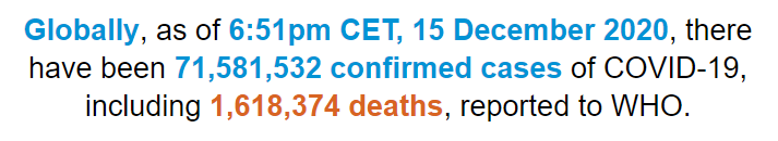根据世卫组织最新实时统计数据,截至欧洲中部时间12月15日18时51分(北京时间12月16日1时51分),全球累计新冠肺炎确诊病例71581532例,累计死亡病例1618374例。15日全球新冠肺炎确诊病例新增496156例,死亡病例新增8443例。
