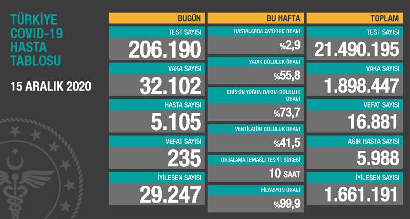 当地时间12月15日晚,土耳其卫生部网站更新的数据显示,当天进行了206190次新冠肺炎检测,32102人检测结果呈阳性,其中有症状患者5105人,土耳其新冠肺炎确诊病例累计1898447例。