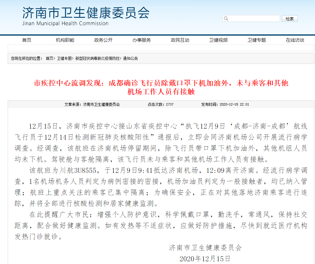 12月15日,济南市疾控中心接山东省疾控中心“执飞12月9日‘成都—济南—成都’航线飞行员于12月14日检测新冠肺炎核酸阳性”通报后,立即会同济南机场公司开展流行病学调查。经调查,该航班在济南机场停留期间,除飞行员带口罩下机加油外,其他机组人员均未下机。驾驶舱与客舱隔离,该飞行员未与乘客和其他机场工作人员有接触。