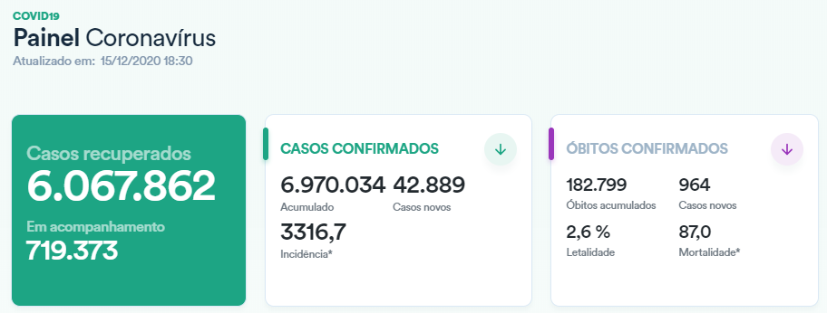 据巴西卫生部发布的最新数据,截至当地时间12月15日,巴西全国新冠肺炎累计确诊病例达6970034例,较前一日新增42889例,新增死亡病例964例,累计死亡病例182799例,累计康复人数6067862人。