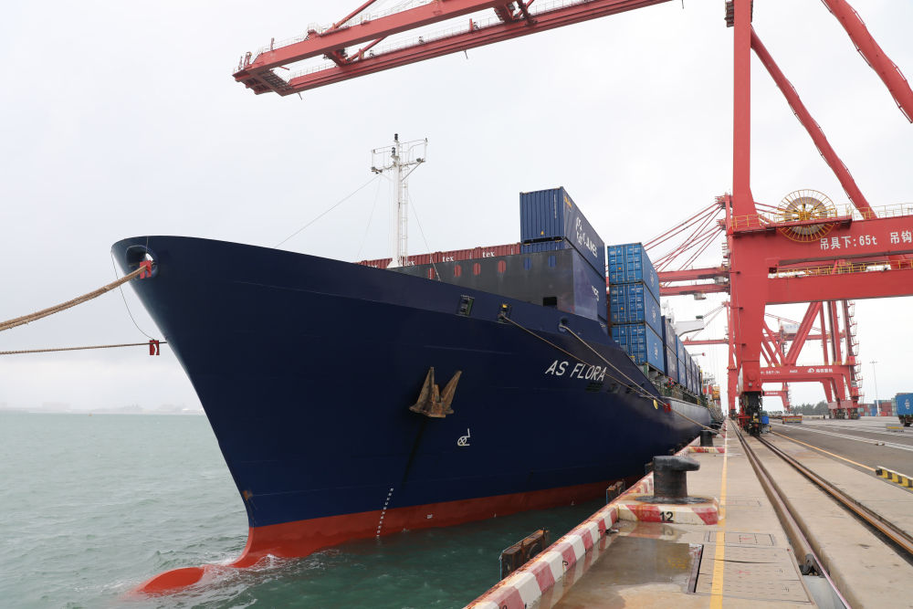 10月29日,随着载箱量为1200标准箱的“AS FLORA”集装箱船从海南洋浦港驶向越南海防,海南自贸港开通了首条由本地航运企业联合运营的外贸航线。新华社记者 吴茂辉 摄