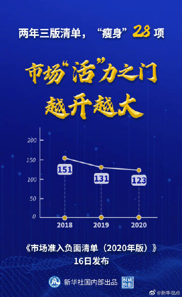 #市场准入负面清单2020年版#【#权威快报# | 2020年版市场准入负面清单“再瘦身”】国家发展改革委、商务部16日公布《市场准入负面清单(2020年版)》。新版清单直接放开“森林资源资产评估项目核准”等措施,删除“证券公司董事、监事、高级管理人员任职资格核准”等措施,清单事项缩减至123项,比2019年版清单再减8项。(记者安蓓 海报设计:张惠慧 张晨光)