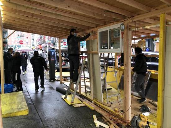 纽约市14日再禁堂食,面对寒冬餐馆无奈,请工人“升级”餐馆户外用餐座。(美国《世界日报》记者颜嘉莹/摄影)