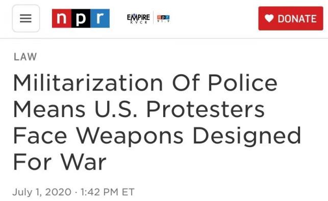 △美国全国公共广播电台评论称,警察军事化等于将美国本土变为战场