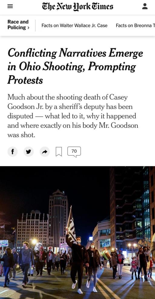 美国俄亥俄州非洲裔青年凯西·古德森12月4日遭到执法人员射杀,引发当地民众广泛关注。尽管当地警方宣称,案发时古德森手持枪械,对警察构成了生命威胁,但受害者家属却表示,古德森当时手中拿着的,只不过是三明治。此外,尸检报告也显示,导致古德森死亡的枪伤,是从背后射击造成的。