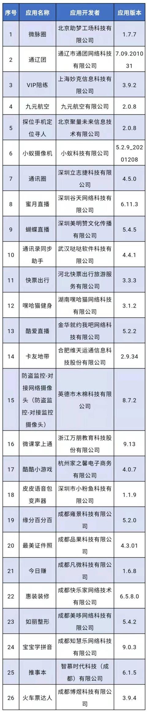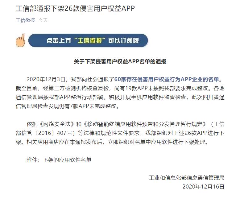 2020年12月3日,工信部向社会通报了60家存在侵害用户权益行为APP企业的名单。截至目前,经第三方检测机构核查复检,尚有19款APP未按照要求完成整改。各地通信管理局按工信部APP整治行动部署,积极开展手机应用软件监督检查,此次四川省通信管理局检查发现仍有7款APP未完成整改。
