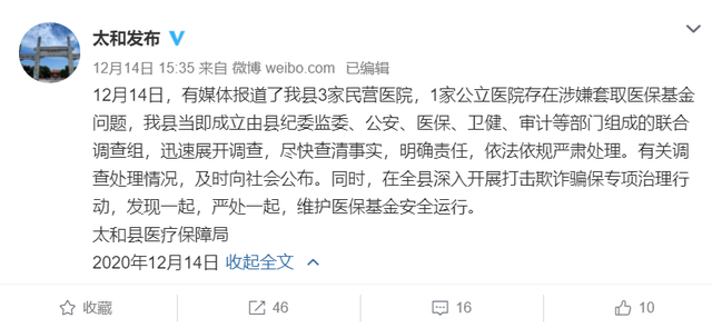 12月14日下午,太和县委宣传部官方微博“太和发布”通报称,成立由县纪委监委、公安、医保、卫健、审计等部门组成的联合调查组,迅速展开调查,尽快查清事实,明确责任,依法依规严肃处理。有关调查处理情况,及时向社会公布。同时,在全县深入开展打击欺诈骗保专项治理行动,发现一起,严处一起,维护医保基金安全运行。