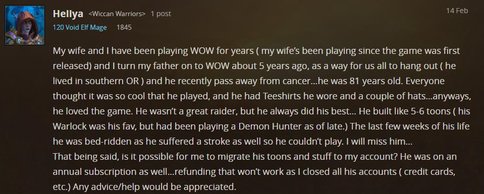 2020年2月14日,一位国外的游戏玩家在论坛发帖求助,希望相关游戏公司可以将其已去世父亲的游戏账号里的角色和装备转移给自己。游戏公司规定,允许逝世的玩家账号所有权转移,不过需要提供死者的死亡证明,或相关遗嘱以及账户接受者的身份证有效证件。几个月后,该玩家发帖称该公司让他接管了账户,但同时也提醒这名玩家,出售和共享账户是违反规则的。