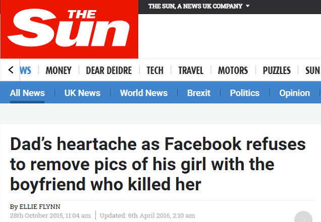 英国《太阳报》此前报道说,一名英国女孩被男友杀害后,其父母要求社交平台删除女孩曾公开发布的与男友的合照,却遭到平台拒绝,理由是不得侵犯用户隐私权。