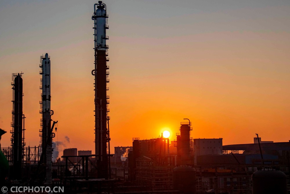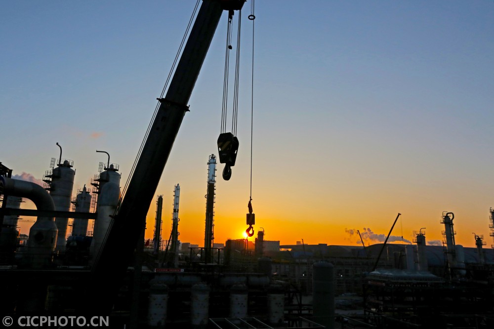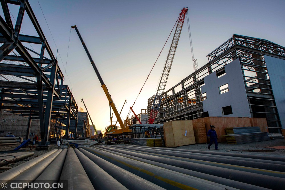 冬日早晨,朝阳映红了工地,新疆哈密市伊吾县淖毛湖工业园区一片繁忙景象,工人们迎着初升的太阳开始忙碌。