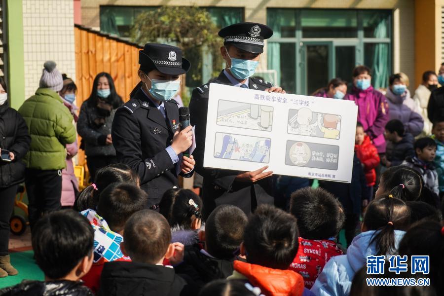 12月16日,在南京雅居乐花园幼儿园,南京铁路公安处南京南站派出所民警给孩子们讲解乘车安全常识。