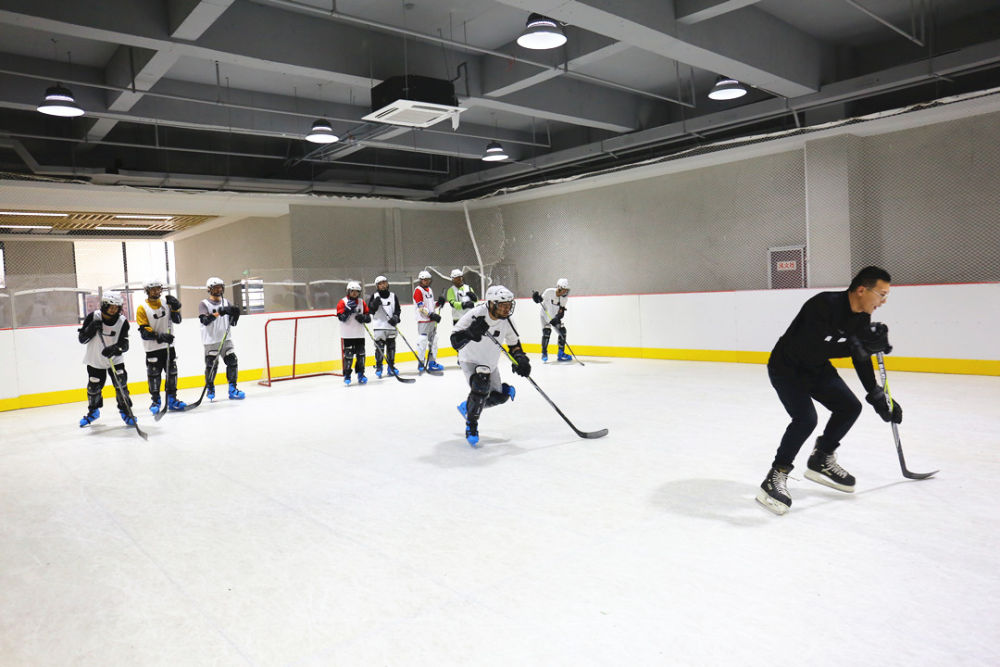 安徽合肥市财经职业学院,教练带着同学们在上冰球课