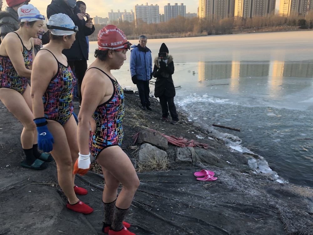 队长王晋忠告诉记者,这支队伍成立于1992年,现在已经有100多名骨干成员。天还没亮的时候,就有人到河边把冰凿开。“从早上五点开始,就陆续有人来游,有要上班的,就五六点来,有的要送孩子上学,八九点才能来,直到傍晚日落时分,一整天都是络绎不绝。”王晋忠说。