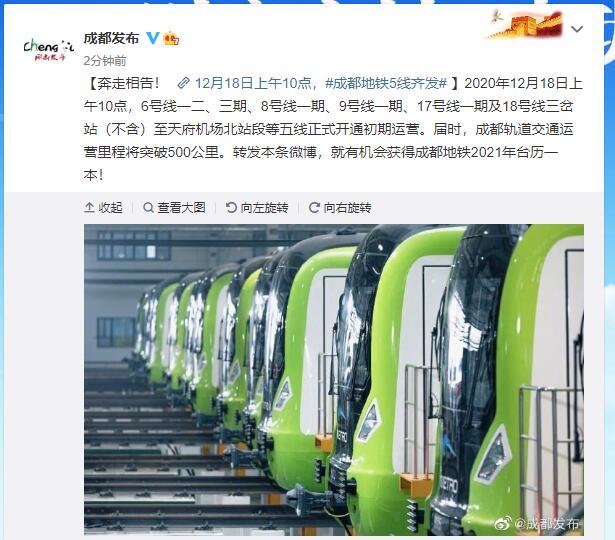2020年12月18日上午10点,6号线一二、三期、8号线一期、9号线一期、17号线一期及18号线三岔站(不含)至天府机场北站段等五线正式开通初期运营。届时,成都轨道交通运营里程将突破500公里。