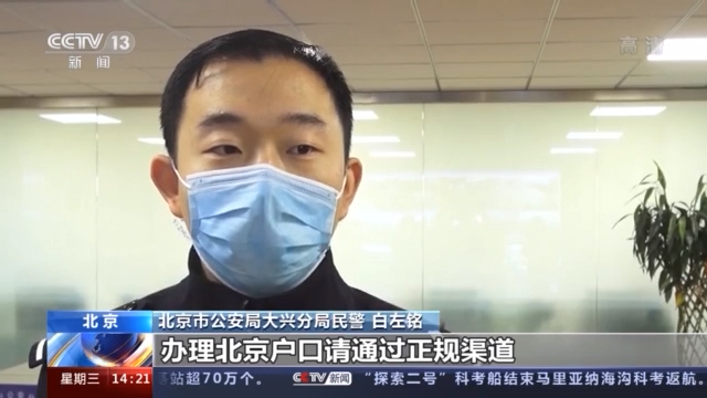 北京市公安局大兴分局民警 白左铭:办理北京户口请通过正规渠道,比如积分落户,比如人才引进计划,切莫相信网上的一些骗子,或者线下的一些自称有关系的人员前去办理。