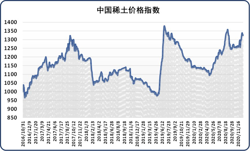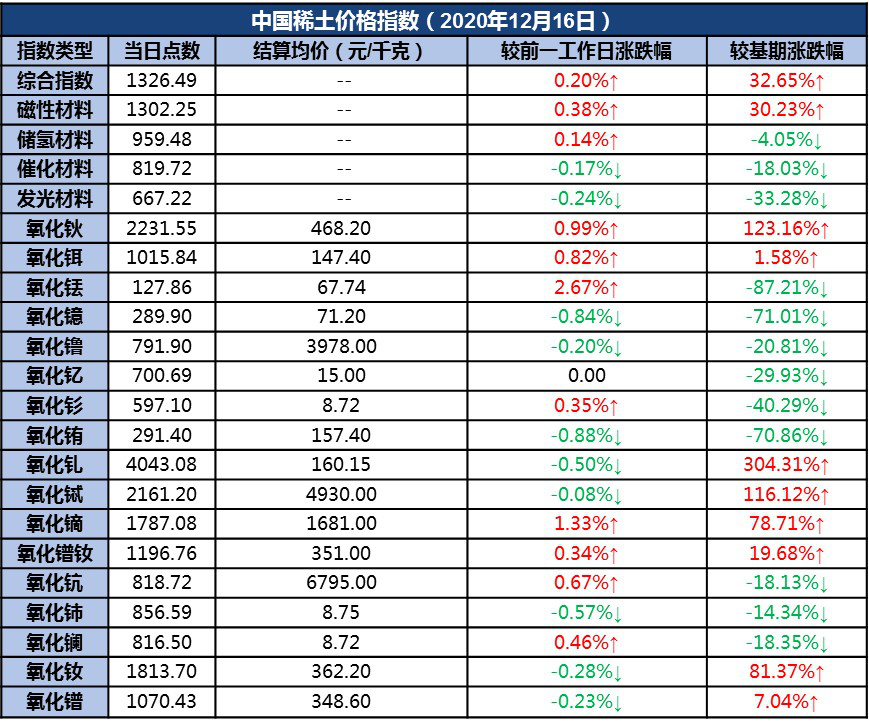 新华财经北京12月16日电(刘星麟)16日,中国稀土价格指数报1326.49点,较前一工作日上涨2.61点,涨幅为0.20%。氧化镝价格上涨,市场询单成交回暖,部分上游厂商惜售、报价偏强,下游企业谨慎采购。