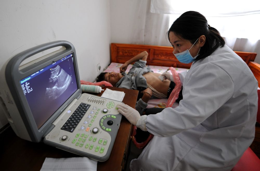 安徽省援藏医疗人员在西藏山南市错那县勒门巴民族乡为村民采用B超检查腹腔,进行包虫病筛查(2017年8月7日摄)。新华社记者晋美多吉 摄