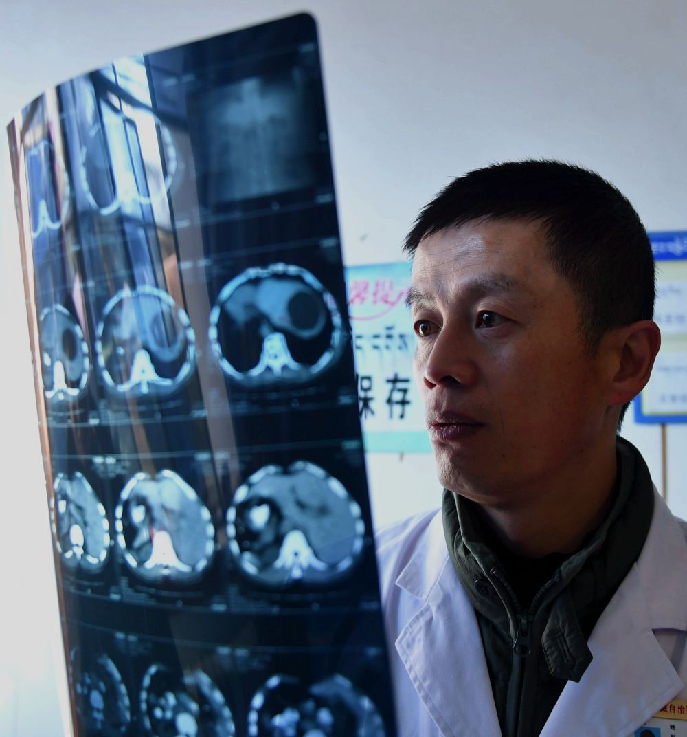 图为西藏自治区第二人民医院医生张庆达在查看包虫病患者CT片(2017年11月14日摄)。新华社记者晋美多吉 摄