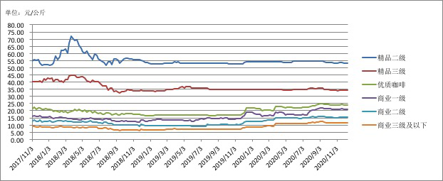 具体来看,精品二级咖啡豆均价报53.38元/公斤,较上期下跌0.03元/公斤,跌幅0.06%;精品三级咖啡豆均价报34.27元/公斤,较上期下跌0.04元/公斤,跌幅0.12%;优质咖啡豆均价报23.97元/公斤,较上期下跌0.02元/公斤,跌幅0.08%;商业一级咖啡豆均价报21.02元/公斤,较上期下跌0.04元/公斤,跌幅0.19%;商业二级咖啡豆均价报15.31元/公斤,较上期下跌0.05元/公斤,跌幅0.33%;商业三级及以下咖啡豆均价报11.67元/公斤,较上期下跌0.04元/公斤,跌幅0.34%。