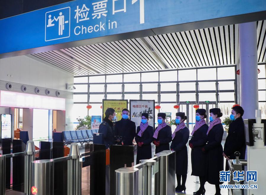 12月16日,在中国铁路兰州局集团有限公司中川机场站,一名客运员(左二)与东航甘肃分公司乘务员交流业务。