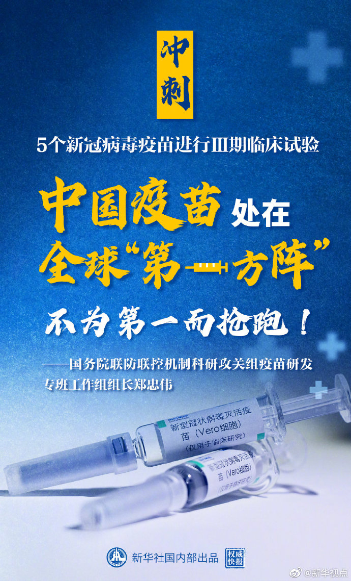 “我国目前已有5个新冠病毒疫苗进行Ⅲ期临床试验,数量位于全球前列。”国务院联防联控机制科研攻关组疫苗研发专班工作组组长郑忠伟接受新华社记者专访时说,“疫苗研发已经进入冲刺阶段,我们处于全球第一方阵,但不为第一而抢跑。”“评价一个疫苗需要多项综合指标,其中安全性、有效性、可及性、可负担性是最重要的。”(记者:陈芳、董瑞丰 海报设计:张惠慧)