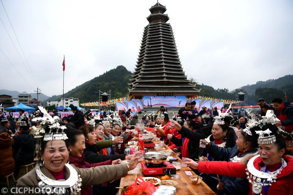 以上图片:在广西桂林市龙胜各族自治县乐江镇江口村,侗族同胞欢聚一堂庆祝侗年。CICPHOTO/潘志祥 摄