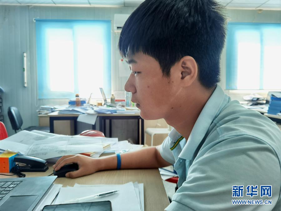 12月15日,在马尔代夫马累,一名脸上有口罩印的技术人员在维拉纳国际机场水飞航站楼项目办公室工作。新华社发(北京城建集团供图)