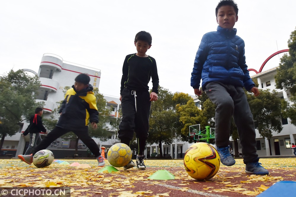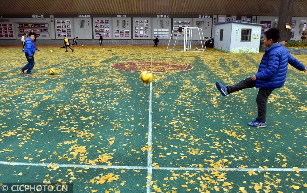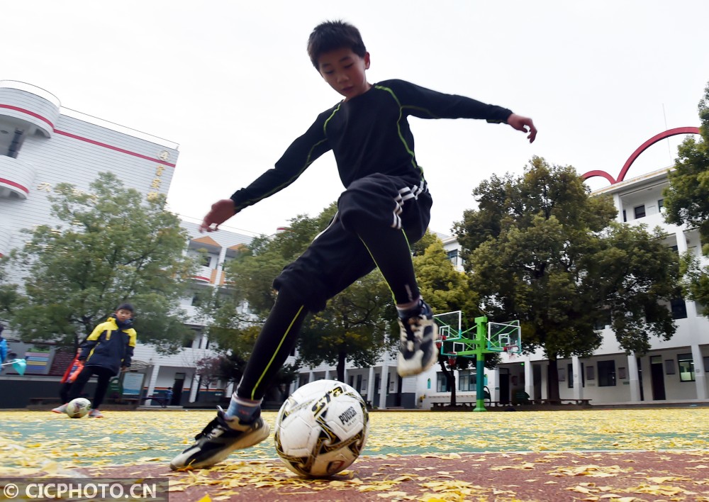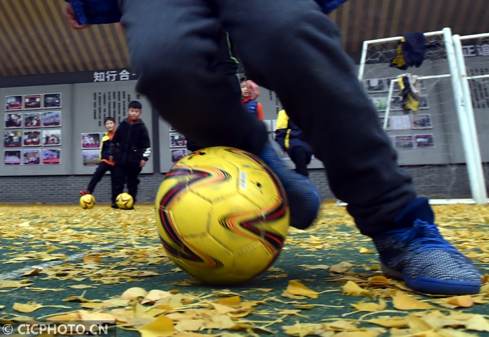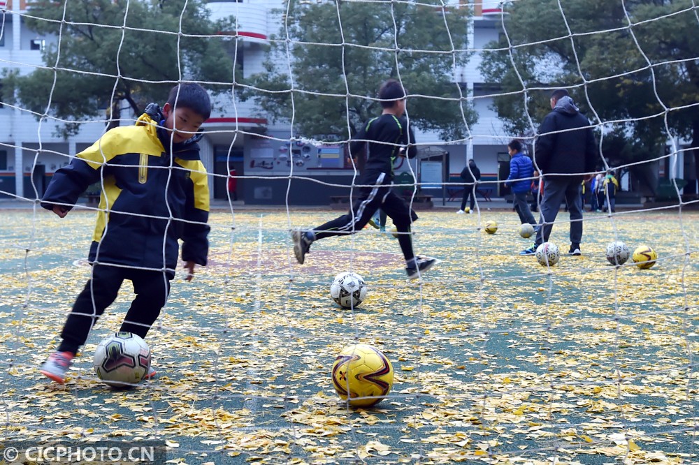 以上图片:2020年12月14日,江苏省扬州市汶河小学的足球小将们利用下午放学后的时间,在铺满银杏叶的操场上进行足球技能和基本功的训练。CICPHOTO/庄文斌 摄