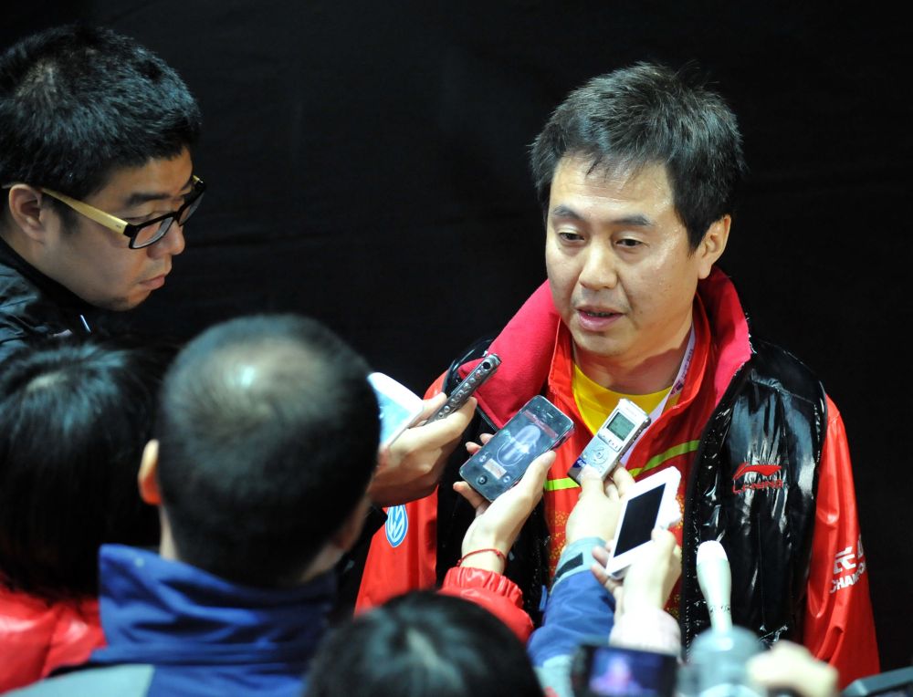 2012年2月25日,中国乒乓球女队主教练施之皓(右)在赛后接受记者采访。
