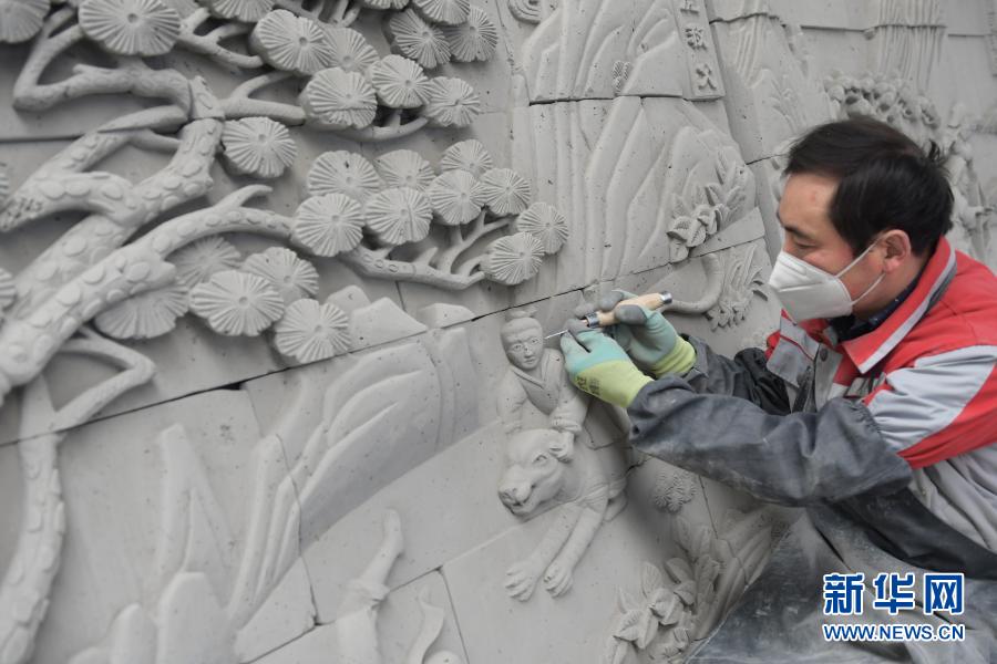 12月16日,在甘肃省临夏回族自治州临夏县一砖雕公司,工作人员在制作砖雕作品。