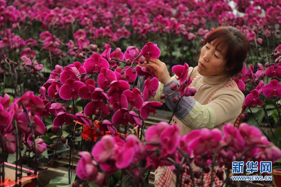 12月16日,甘肃省定西市临洮县三易花卉基地工作人员在整理蝴蝶兰。新华社发(王克贤 摄)