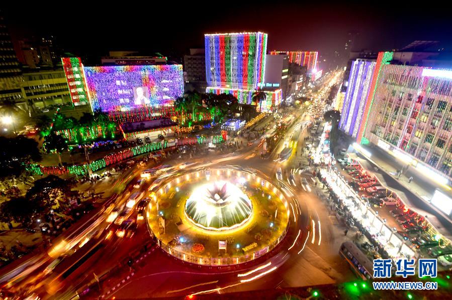 12月15日,在孟加拉国首都达卡,建筑物被彩灯装点。 12月16日是孟加拉国的胜利日。 新华社发