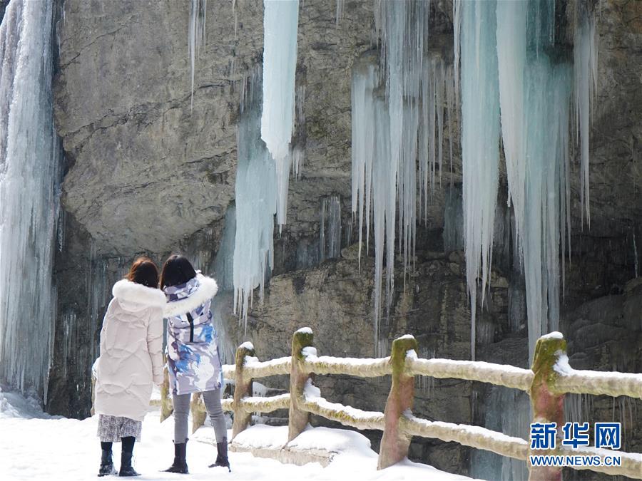 这是官鹅沟内的一处冰瀑(12月16日摄)。 连日来,持续低温让位于甘肃省陇南市宕昌县境内的官鹅沟国家森林公园银装素裹,景区内群山湖泊被冰雪覆盖,一道道冰瀑高挂悬崖,宛若一幅美丽画卷。 新华社记者 张百慧 摄