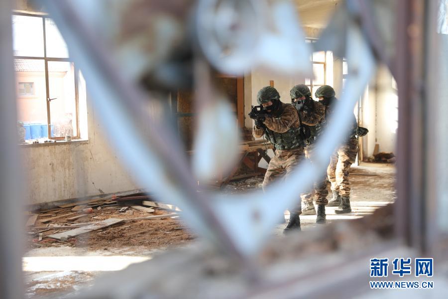 武警第一机动总队某支队特战队员在进行房间搜索训练(12月15日摄)。新华社发(常龙 摄)