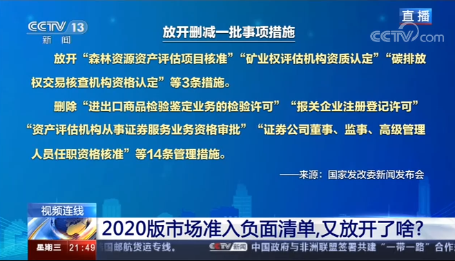 国家发展改革委、商务部今日公布《市场准入负面清单(2020年版)》。市场准入负面清单自2016年试行,2018年正式实施,到今年已经是实施的第三个年头,清单上的事项也是越来越少。今年的清单,最重要的变化是什么?这几年,市场准入持续降低门槛的效果怎样?门越开越大之后,我们的市场又如何更健康公平?一起来关注,2020版市场准入负面清单,又放开了啥?