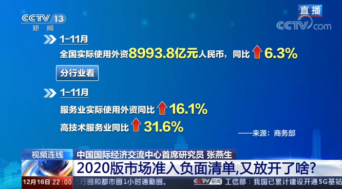 中国国际经济交流中心首席研究员 张燕生:市场准入的负面清单,从2016年的328项减少到123项的过程中,比如说今年的前十一个月,外商来华投资,实际使用外资在服务业部分的占比已经上升到78%,这是一个非常大的进步。很难想象也就是我们的这个服务业实际使用外资的比重能上升到78%。中间包括相当一部分是研发服务、技术服务、设计服务、信息服务和产业的数字化、营商环境的高效化以及制度成本的减量化,这些变化都是跟我们投资环境的重大改革和市场准入负面清单的不断“瘦身”是有重大关系的。