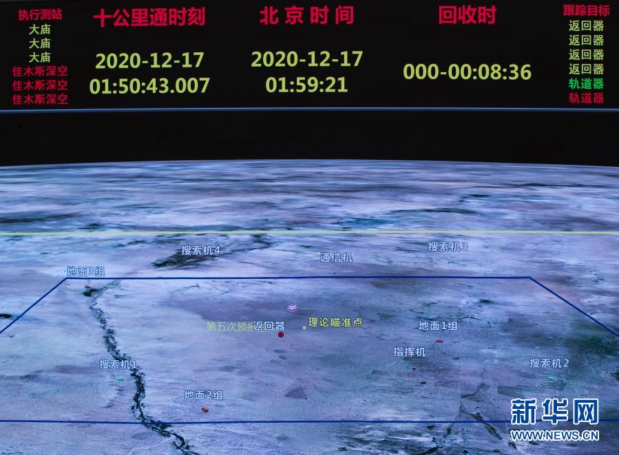 在北京航天飞行控制中心指挥大厅拍摄的嫦娥五号返回器在内蒙古四子王旗预定区域着陆示意图(12月17日摄)。