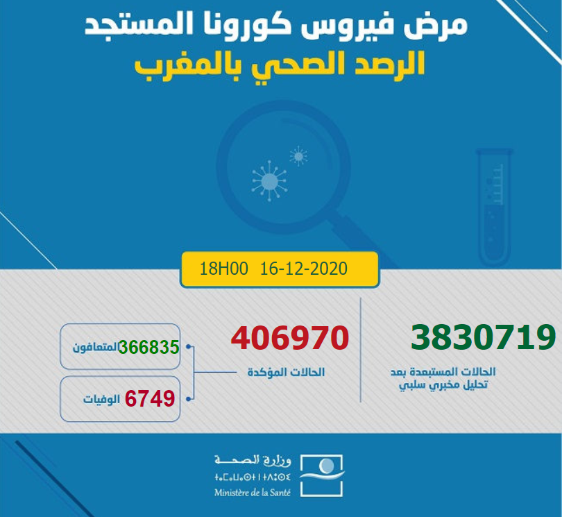 摩洛哥卫生部12月16日证实,该国在过去24小时新增3351例新冠肺炎确诊病例、38例死亡及3924例治愈。截至目前,摩洛哥已经累计确诊新冠病例406970例,死亡6749例,治愈366835例。
