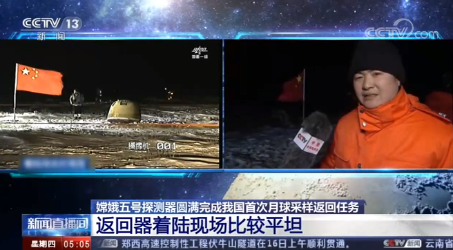 总台央视记者 王刚:随着搜救直升机,我们第一时间抵达了返回舱,近距离观看了返回舱的状态。这次降落得非常完美,且呈直立状态。现场处置工作也是非常有序。首先,现场处置的队员对返回舱的外观进行检查,完成了坐标的定位。另外,还建立了一个警戒区域。2时45分,地面的车辆三支分队已经陆续抵达,队员正在进行一些外围工作的准备,包括建立通信站,和北京飞控中心和指挥中心取得联系,确保能够将现场的实时画面传回。